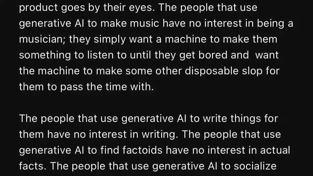 Text reads: Generative Al is being marketed as a tool designed to reduce or eliminate the need for developed, cognitive skillsets. It uses the work of others to simulate human output, except that it lacks grasp of nuance, contains grievous errors, and ultimately serves the goal of human beings being neurologically weaker due to the promise of the machine being better equipped than the humans using it would ever exert the effort to be. The people that use generative Al for art have no interest in being an artist; they simply want product to consume and forget about when the next piece of product goes by their eyes. The people that use generative Al to make music have no interest in being a musician; they simply want a machine to make them something to listen to until they get bored and want the machine to make some other disposable slop for them to pass the time with.